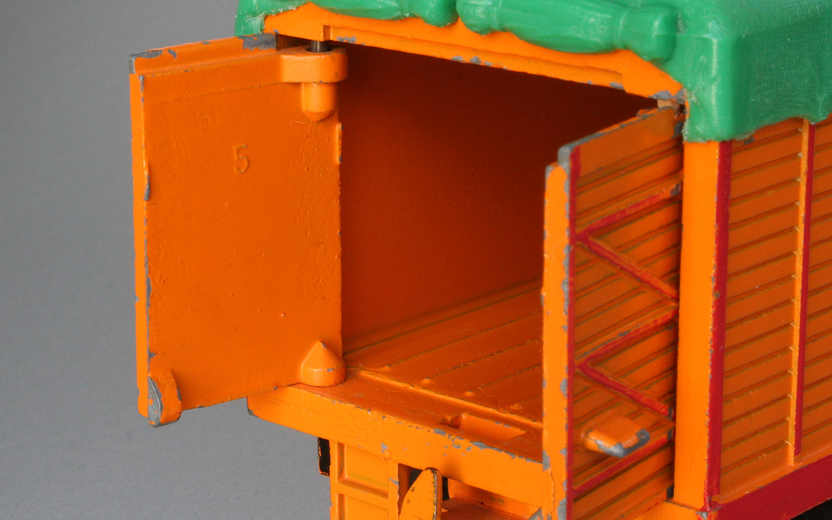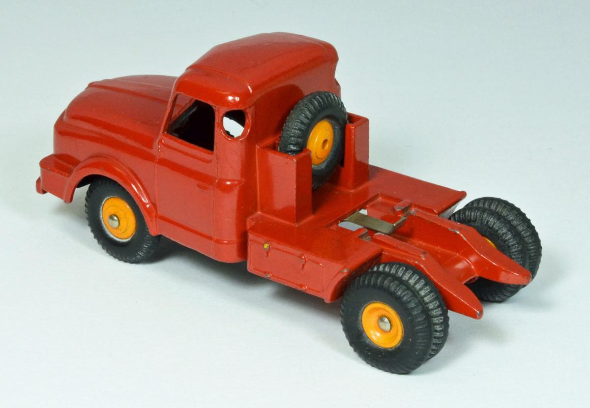 The trailer is a very good model of a Fruehauf design, and has an amazing amount of detail, including opening doors on both sides as well as the rear.  The simulated canvas top is accomplished by using a plastic casting, which works quite well.  Is this possibly the very first use of plastic on a Dinky Toy?  Another very nice touch is the use of dual wheels and tires on both the trailer and the tractor, which adds considerable realism.  In fact, this model uses a total of 16 tires and wheels, when the spares are included.