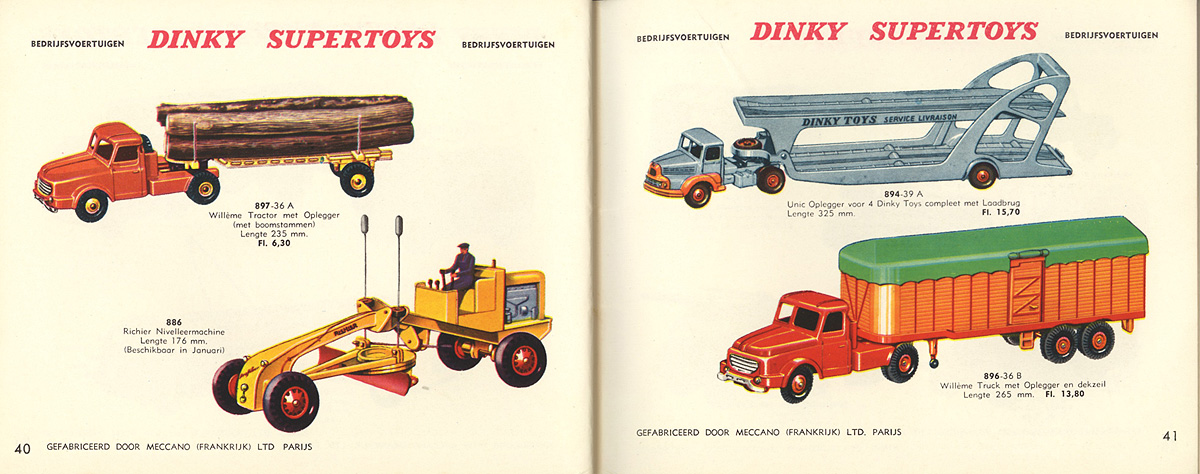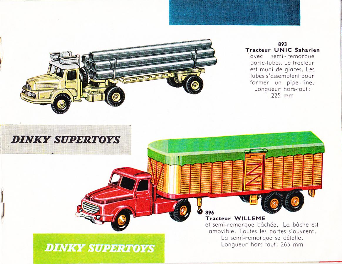 This was introduced in very late 1958, and first appeared in the 1959 French and US catalogs, and was made until 1971 under the new number of 896.  After handling this model, one becomes very aware of just how heavy it is, and indeed, looking at the bottom of the trailer shows why:  There are extensive structural ribs running both front to rear and also side to side.  This, along with all those wheels and tires must have added considerably to the cost, as it was listed in the 1959 US catalog for $5.50, more than any other model except the very large 983 Car Carrier and Trailer.  This makes a great display piece and a wonderful companion to the log truck!