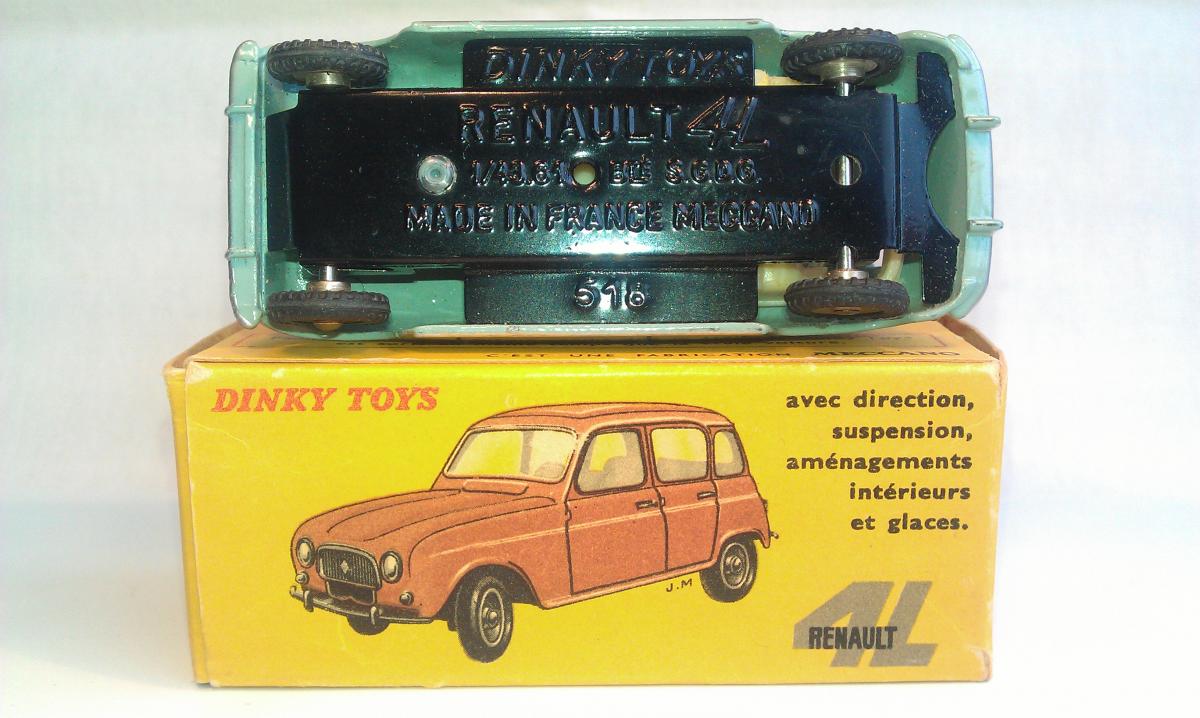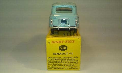 The Renault 4L was produced by Meccano France from 1962-1971. It was issued with steering wheel direction, suspension, interior, windows and highly detailed silver trim around the car. It got model number 518 and replaced the 524 Renault Dauphine. The Renault 4L was also available in UK with the same model number 518 and was part of a series of imported Dinky Toys from France to UK with the slogan "Dinky Toys from Paris ". I show model 518 (in a somewhat strange UK order) in the various advertisements in Meccano Magazine France and UK and the DT catalogues and leaflets.