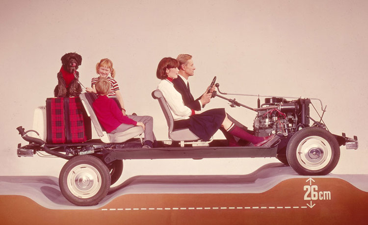 Because the rear torsion bars are located one behind the other, the wheelbase is longer on the right side than on the left.