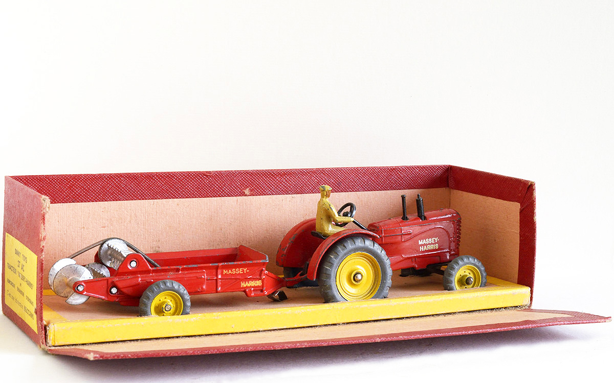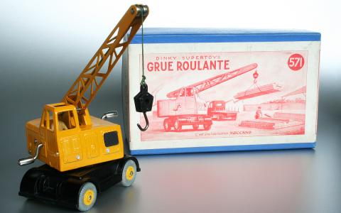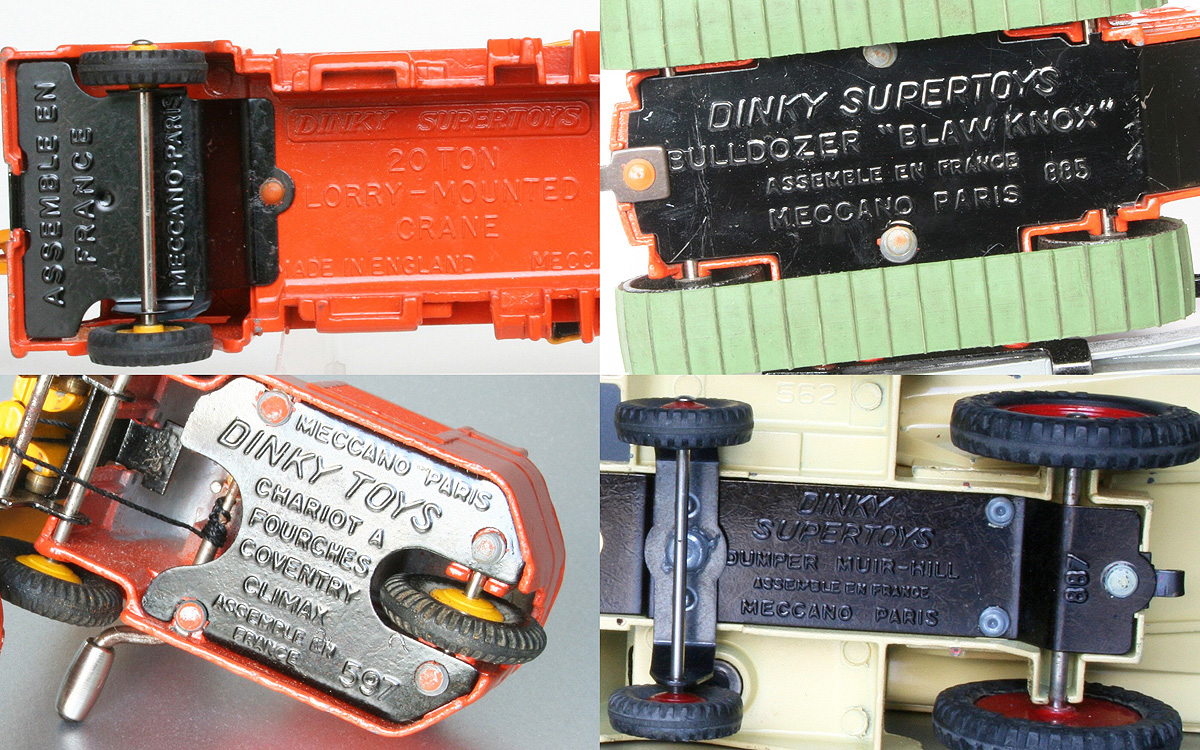 As far as I know these Bobigny assemblies were not available anywhere else: the UK, the Commonwealth countries and the other export markets saw the original Liverpool products only. Some other complete British Dinky products were packed in (scarce) French boxes only, a simple way to expand the far smaller range of French Dinkies more quickly in the early 1950s. The easily exchangeable, more or less ‘anonymous’ large commercials (i.a. the Coventry Climax 14c-401>597, the Blaw Knox Bulldozer 561-961>885, the Muir-Hill Dumper 562-962>887, the Coles 20t Lorry Mounted Crane 972>571) were in majority in this category (imported from England, or assembled and painted in France), as the distinct British cars were less suitable for the French market, because they were not that familiar on the French roads, like their own Citroëns, Renaults, Simcas etc.