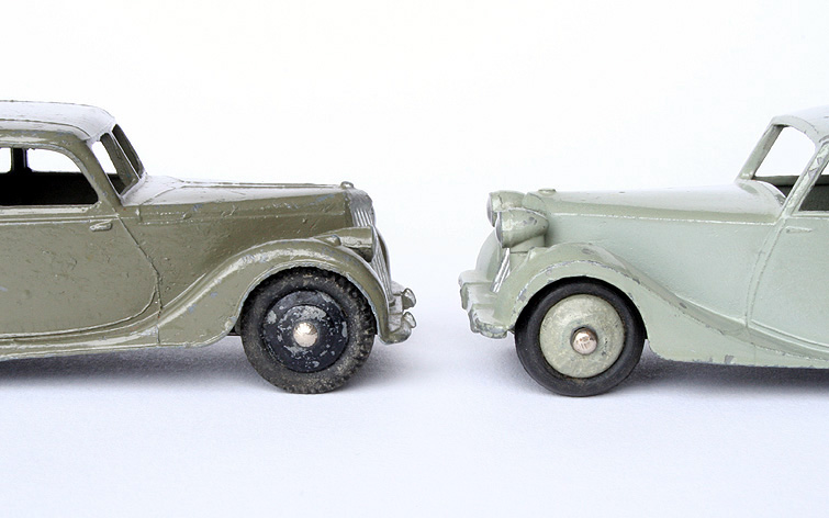As a final and latest example a no. 40a Riley Saloon with treaded tyres (the earliest version of 40b Triumph on the right). I know no other examples of the 40series saloons than this earliest 1947 black hubs version of this car that have treaded tyres. So, in my opinion this model is the latest Dinky Toy that could normally have been fitted with treaded tyres.
