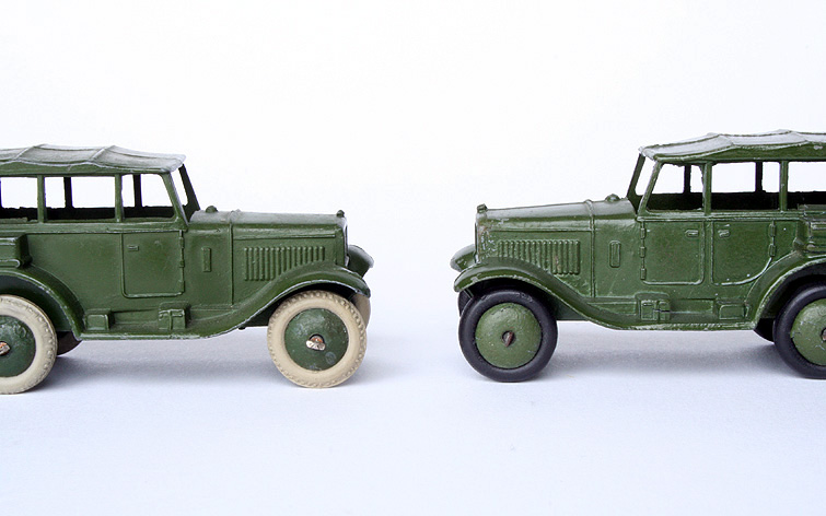 Indeed, the no. 152b Reconnaissance Car can have smooth tyres, but also treaded tyres, both black and white. The one on the right is of ca. 1937, having smooth tyres, the one top left is early post-war (1945-1946) with treaded WHITE tyres. I have seen more early post-war Dinky’s with these tyres, like a no. 34b Royal Mail Van and some no. 30 cars – if I’m not mistaken. I guess these white treaded tyres are restricted to this very early post-war period only. Lower left there is a post 1946 Reconnaissance Car, often with the fine treaded tyres, but also often seen with the ‘regular’ smooth black tyres.