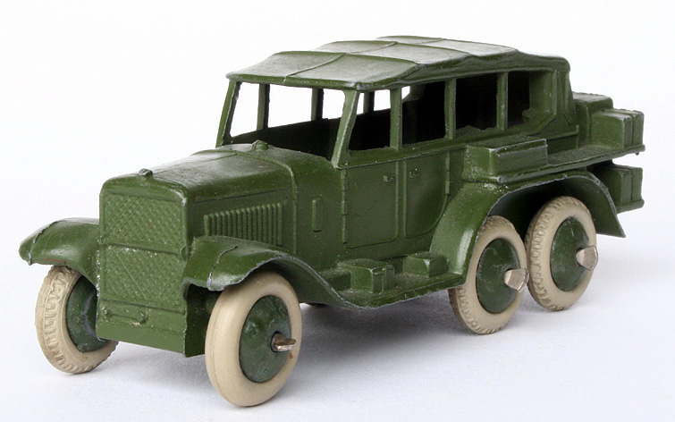 The oldest examples I know are not early post-war, but late pre-war, like the examples above. On top the no. 151b Transport Wagon, the pre-war on the left, the post-1946 on the right. The pre-war example showing the treaded tyres, the post-war with smooth ones. In addition a (late pre-war) no. 22s Searchlight Lorry, as far as I know virtually always with treaded tyres.