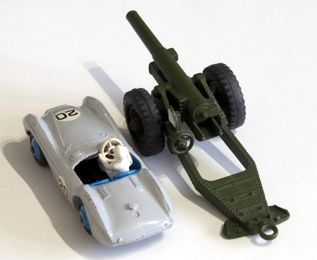 The barrel elevator wheel on the Howitzer is also used as the steering wheel on the Dinky sports cars such as the 110 Aston Martin etc.