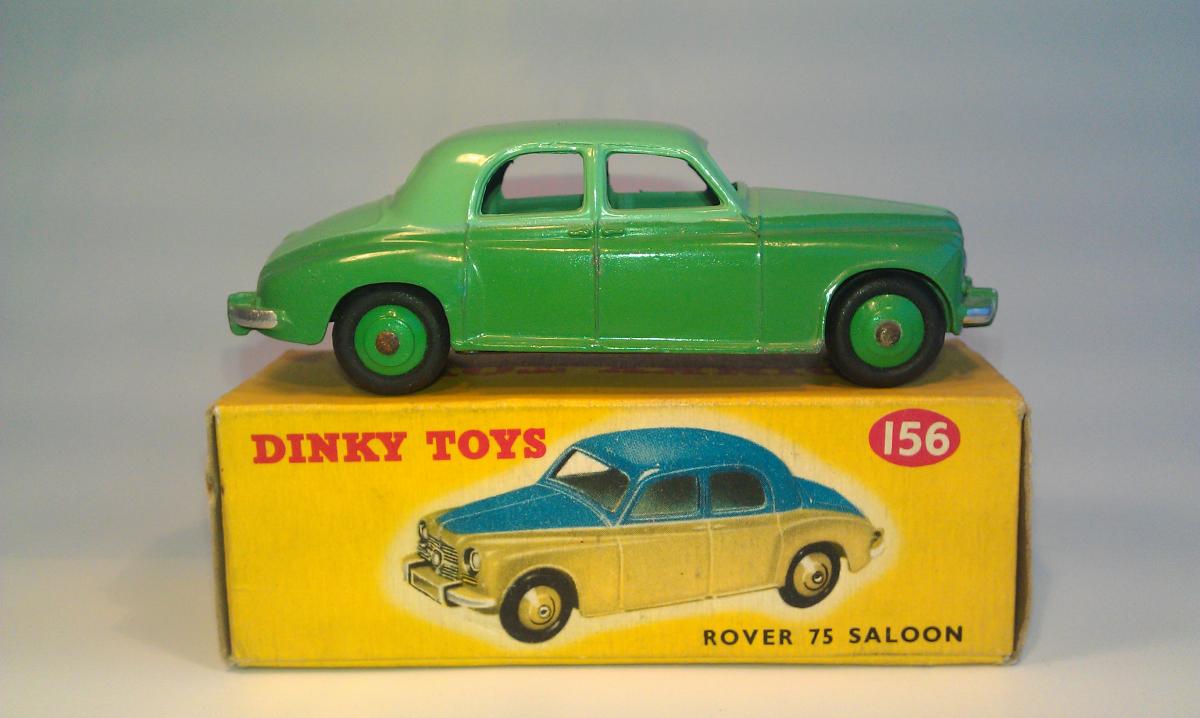 After a disappointing purchase I sold the 156 Rover 75 blue/cream with non-original rivets (of course with the correct description to the buyer). Instead I bought a better 156 2-tone green with number 156 in the base plate and Rover 75 cast-in underside of the roof. The box has the correct colour spot and a pencil price of 3 / - on it. This was the price from October 1955 to May 1958.