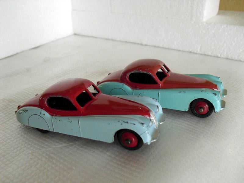 I am not certain about the accuracy of the red XK120 - the rear wheel covers (known as spats over here) have been altered probably to provide a better view of the "wire" wheels. I have never seen covers with a small opening - however, having said that, I guess anything is possible!