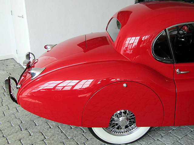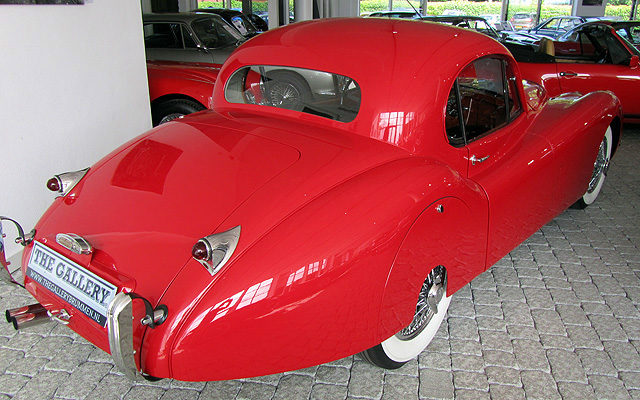 1952 Jaguar XK 120 Fixed Head Coupe rear side with separate bumpers and taillights. Also with the original removable spats (fender skirts)