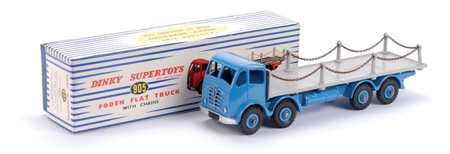 The first image below is for a lot containing a 905 Foden Flat Truck with Chains in red and grey.  This was the description: DINKY SUPERTOYS 905 FODEN FLAT TRUCK WITH CHAINS- BOXED