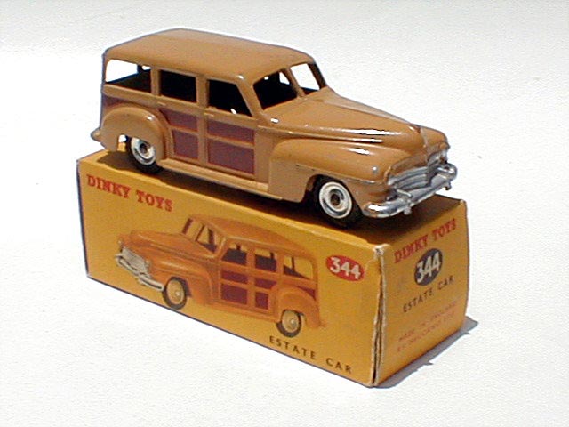 Dinky No.344 Estate Car - light brown with dark brown panels, spun hubs, ridged black tyres and later baseplate with No.344 inscribed - Near Mint in Fair dual numbered picture box. Scarce.