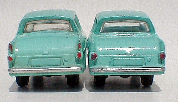 In the absence of any comment on the above post I am attaching hopefully better images of the two quite distinct castings. The one on the left has the flatter boot line and les curve of the lower back window, with the one on the right having a rounded boot line and more curve with the lower back window.
