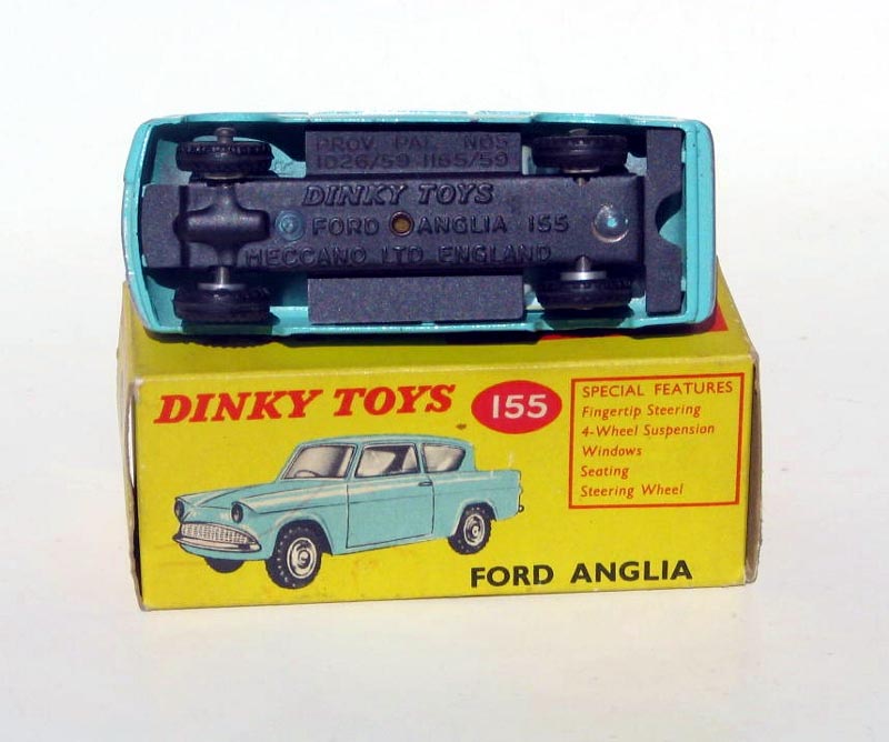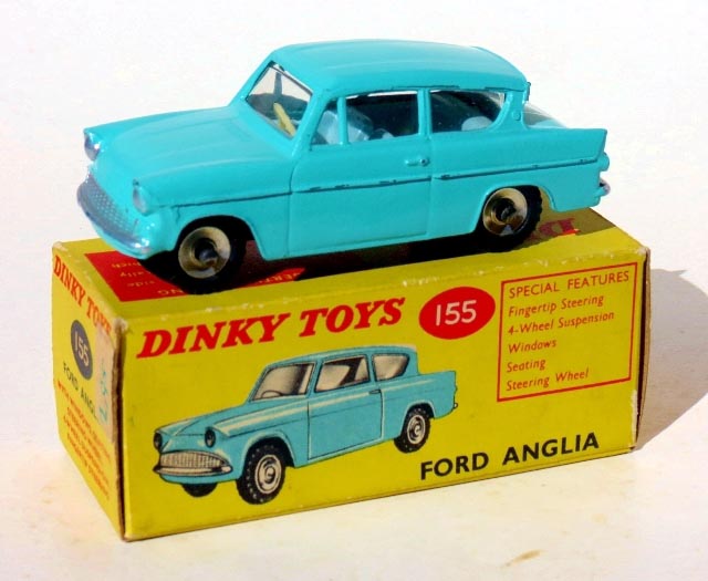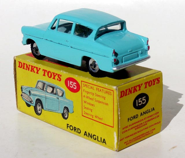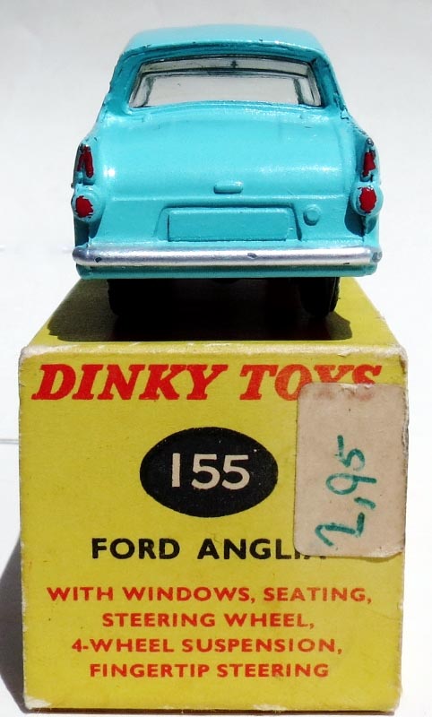 As for the 155 production time frame, most references have it in production until 1966. The model made its last catalogue/leaflet appearance in August 1965 priced at 3/11 but by the time a price list leaflet was published the following month, September 1965 the 155 Ford Anglia was not included. So one can safely say that the Anglia had been deleted by this date. Of course, the model would still have been available after this time in most toy shops, and certainly much longer in Australia.