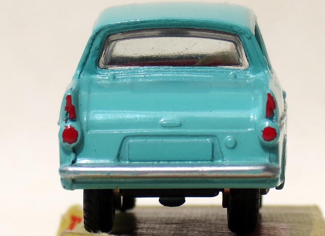 The Dinky model was introduced in July 1961 with an advertisement in the M.M., showing a turquoise model (the Ford colour was 'Caribbean Turquoise') - however, if you check your Dinky catalogues you will see that it was shown two months earlier in the 9th edition catalogue, (print ref. 7/561/700 = May 1961) in yellow - as per the leaflet pictured by Bruce recently. Presumably this indicates that there had been an earlier intention for the model to be painted yellow. Despite this, the standard colour throughout the production life of this model was turquoise - originally with a red interior and 'Mirror-gloss' base, then towards the end of production with a satin-black base and light blue interior.