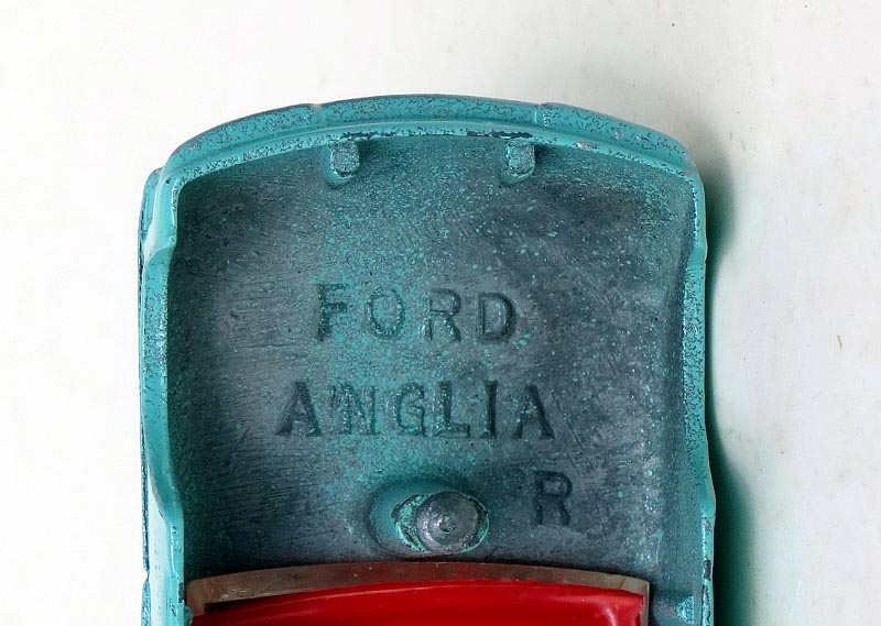 Together with the above, I have a query. Under the bonnet on the interior of the casting can be found FORD ANGLIA and then on the lower right, the letter R. This letter has been found on all the 155 Ford Anglia that have passed through my hands, including the example with the light blue interior which has the rounded boot, the subject of the above photograph.