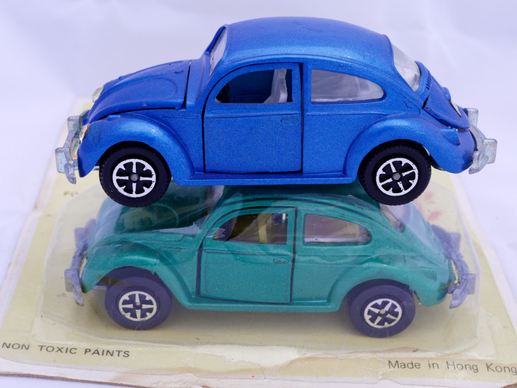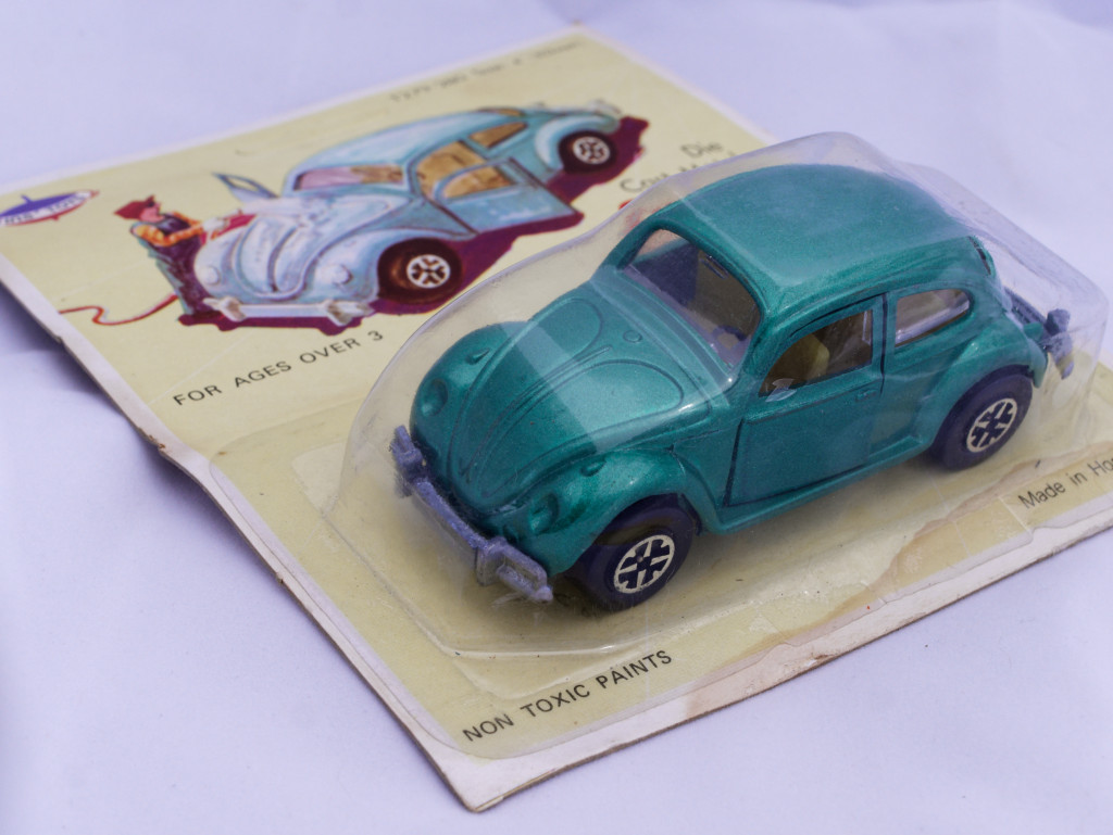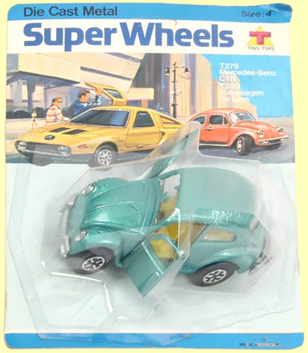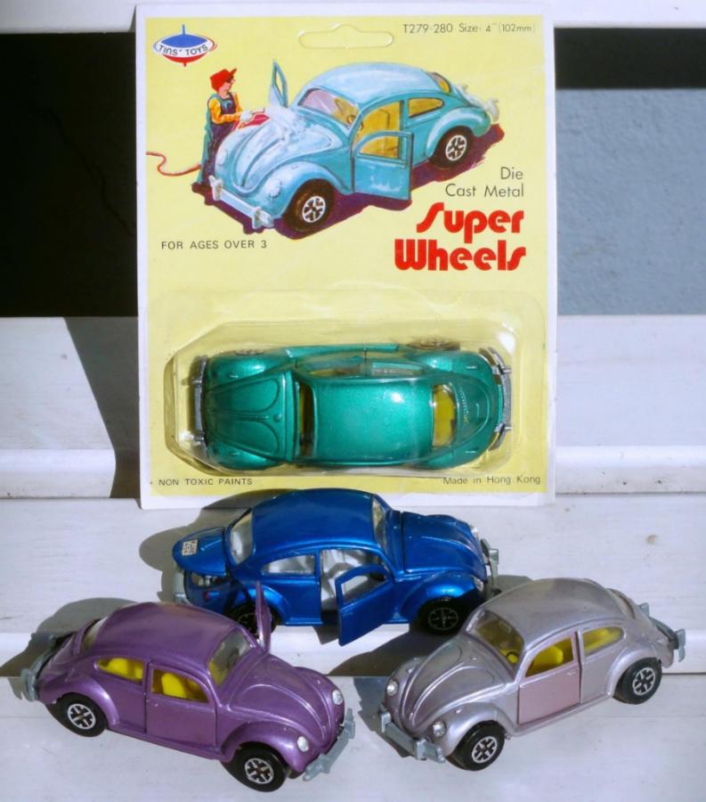 I am attaching a picture that was taken by Mick Driver (not the same as our Michael Driver) in Copenhagen. It shows the front of the blister and several color variants of the Tins' Toys model, again alongside the blue original Dinky. Mick collects Hong Kong copies and stated that a sample of this Beetle still in its blister pack took him 20 years to find (so no I will not be opening it, though I too would dearly love to see the base plate).