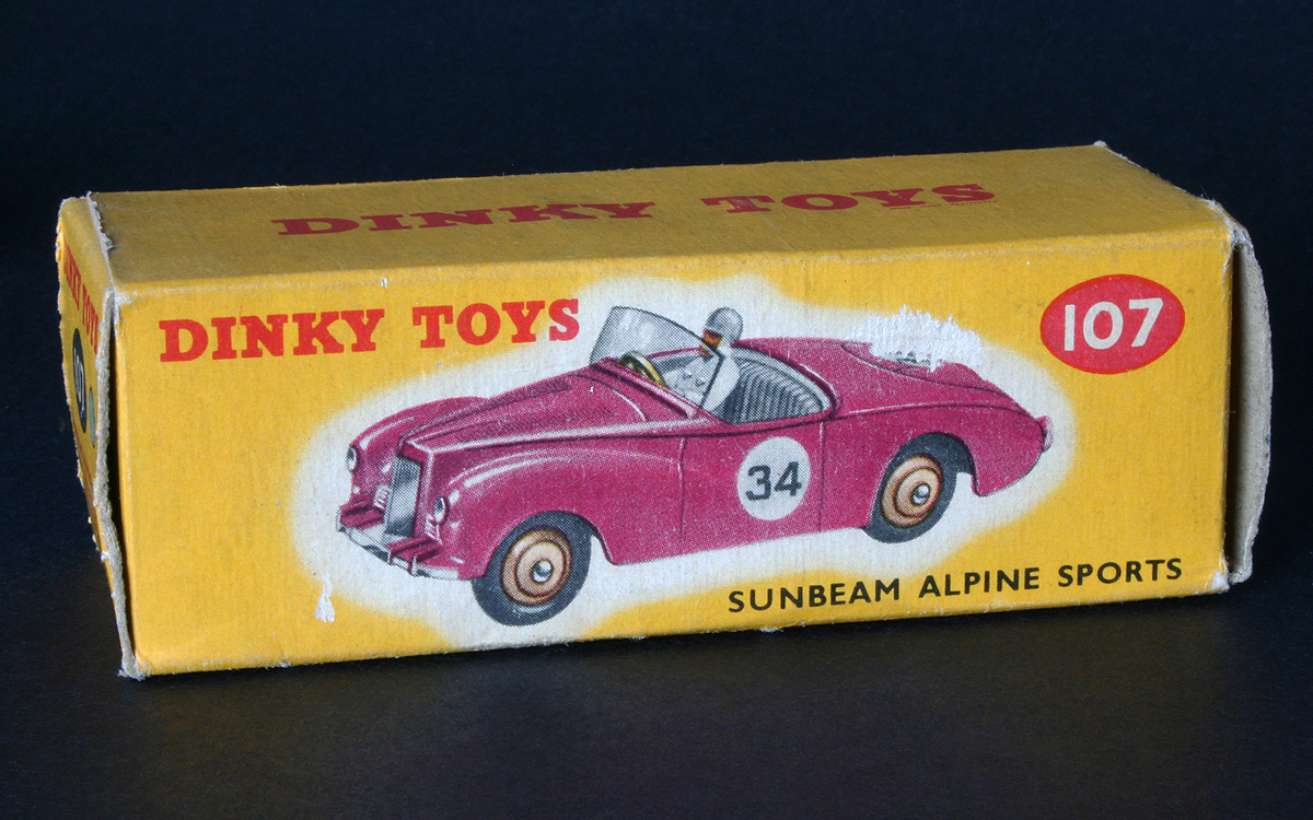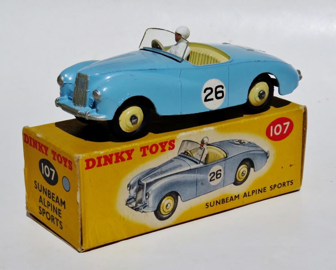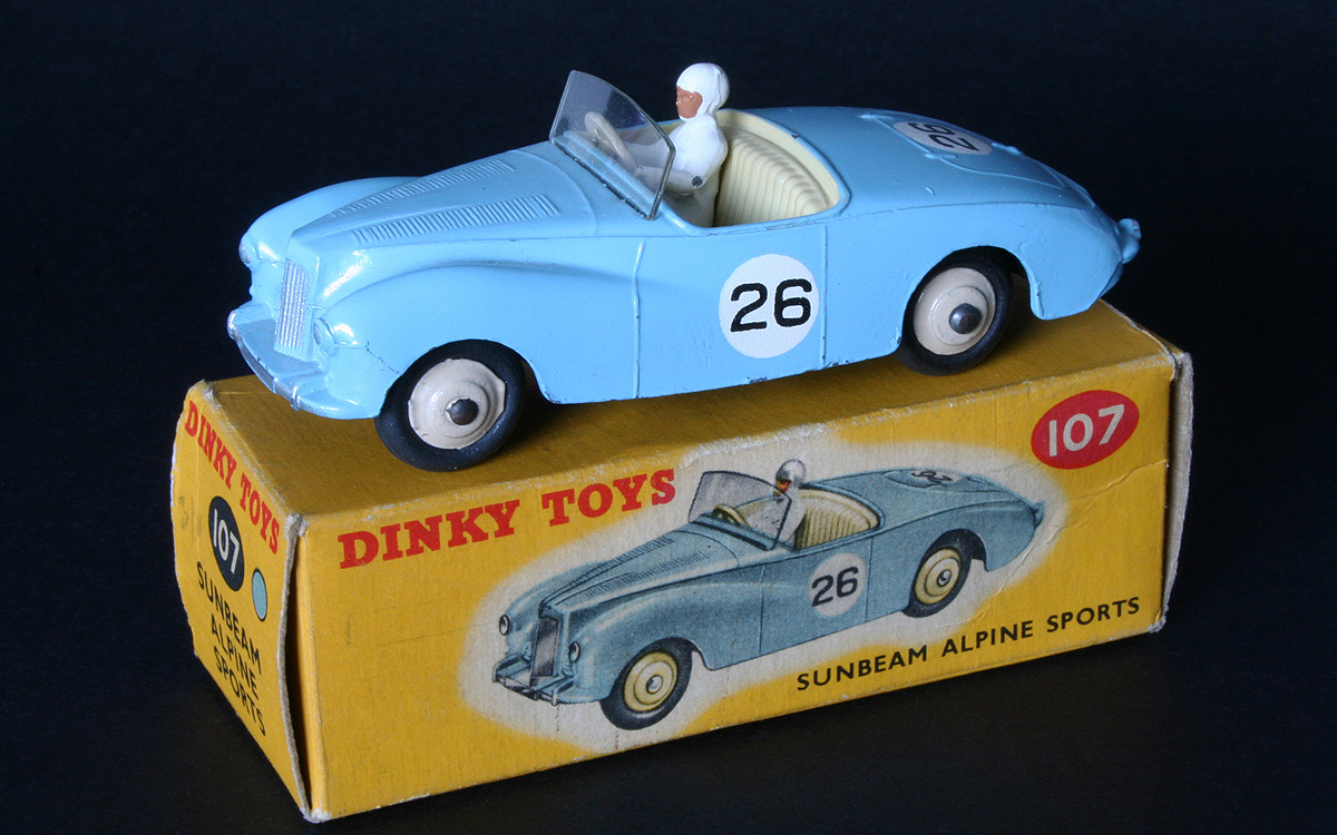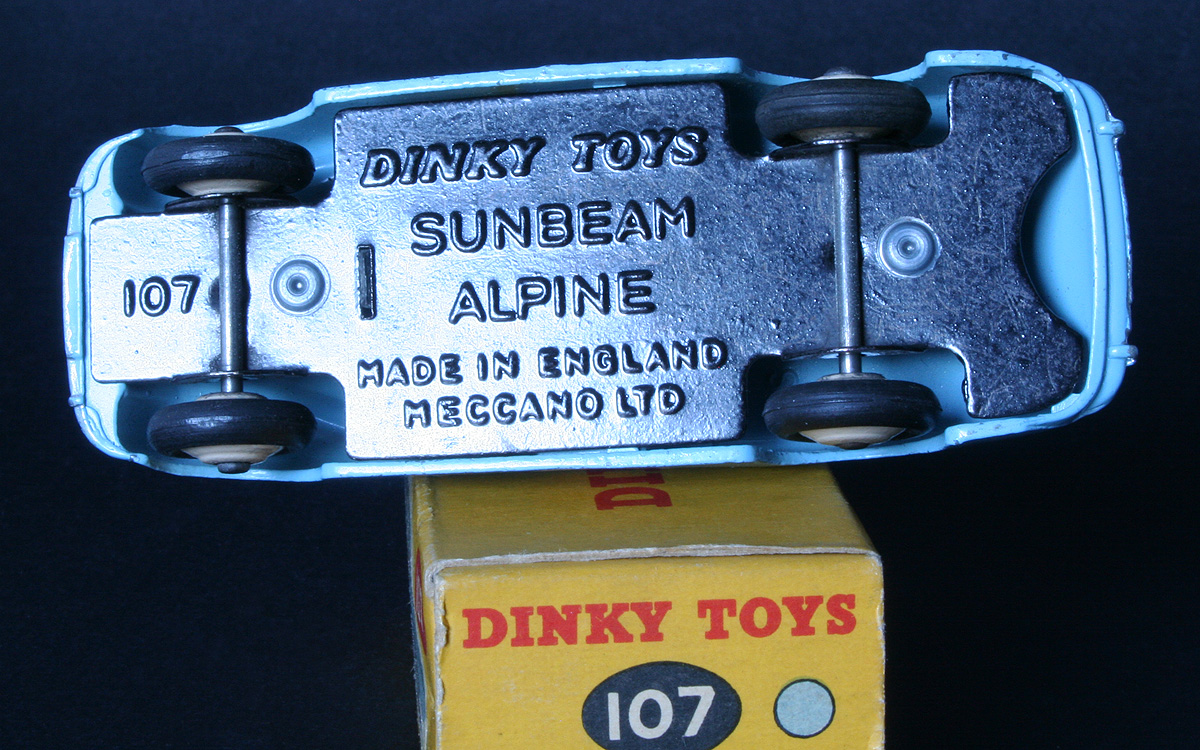 Just found some older photos of my (only) Sunbeam Alpine, in competition finish, blue with competition no. 26. It is an early example with smooth tyres, upright brand lettering on the box and the reference number 107 embossed into the base plate.  I like this special 'by night' presentation. Kind regards, Jan