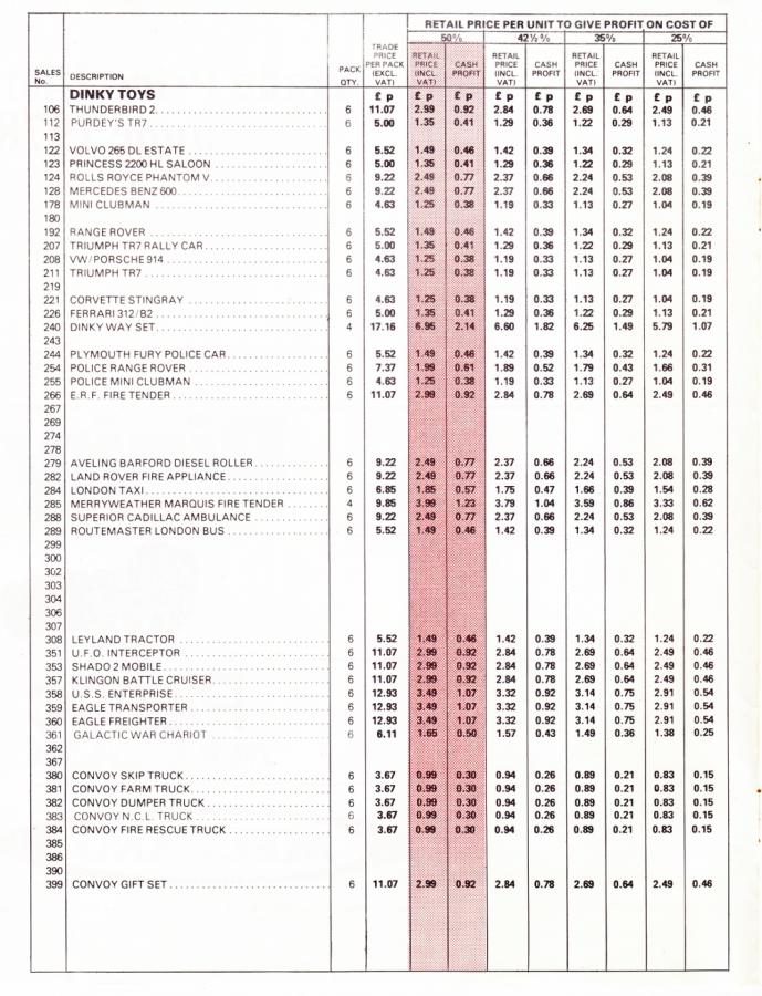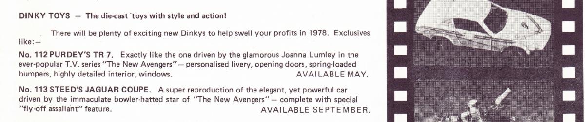 The 1978 Trade Price List dated June 1978 (actually printed on 27 February 1978), lists 112 Purdy’s TR7 as being available as from May 1978 included in the Price List at a wholesale price of ₤5.00 per trade pack of six cars.  113 Steed’s Jaguar Coupe is shown as being available in September 1978 although the price list has no prices as yet.  Is it possible the special feature of a “fly-off assailant” may have been one of the causes for the model’s failure to appear in September 1978 and for the rest of the factory’s existence?