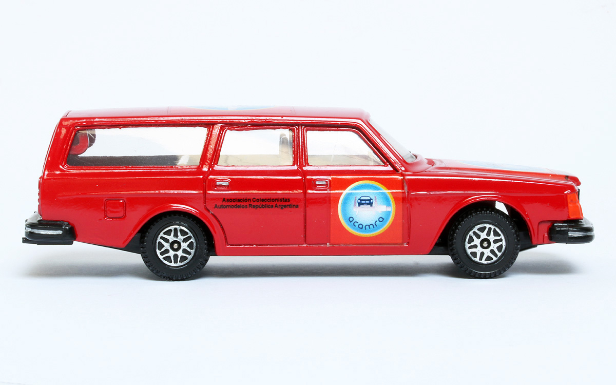 Not really my favourite kind of Dinky Toys, this 1/35 scale Volvo 265DL Estate Car, but I make an exception for this very example, a gift from a fellow enthusiast from Argentina, who visited me back in 2014. Whereas metallic blue, white and orange are the standard colours, this one is deep red, with matt orange light details fore and aft, and it bears the decals of the Argentinian Acamra – Asociación Coleccionistas Automodelos República Argentina.