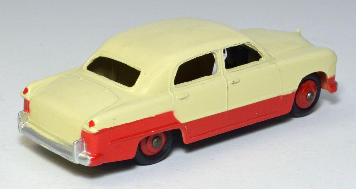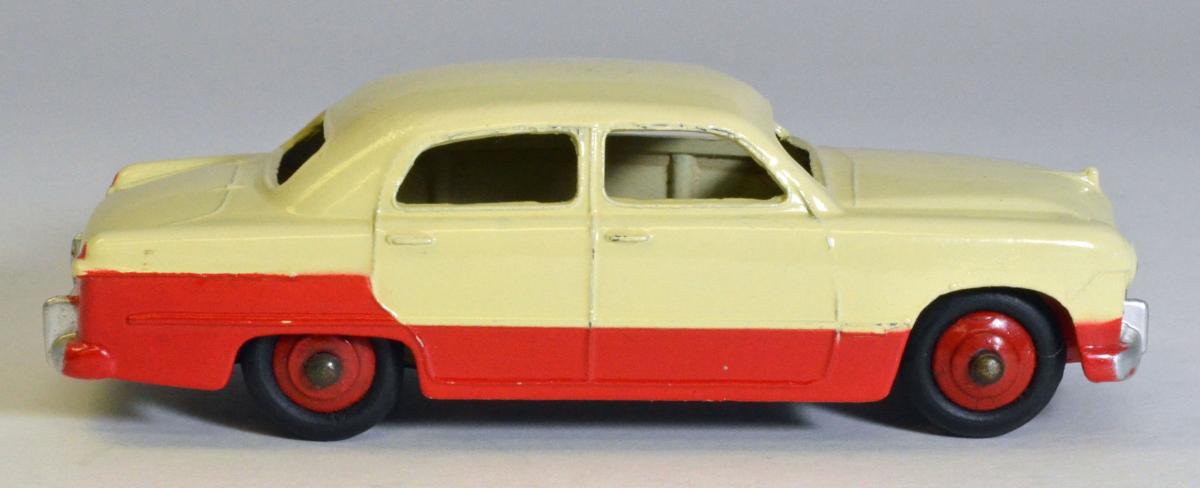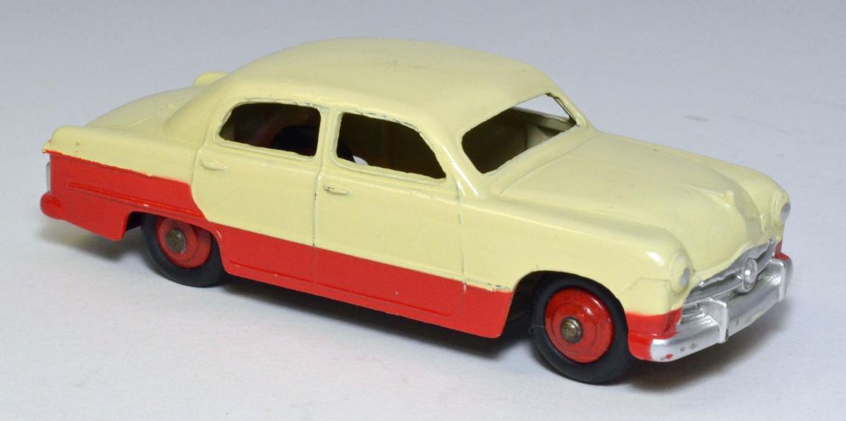 I only have one 170 Ford Fordor Sedan to contribute here, but it is the low-line version in red and cream. I bought this in 1959-1960 directly from H. Hudson Dobson, and at the time, definitely did not like the two-tone colors that Meccano was introducing on our Dinky Toys. Included is a photograph of the box, which shows a high-line version. My question is, did Dinky ever make this box with the correct low-line illustration, or did they simply have plenty of high-line boxes and just used those?