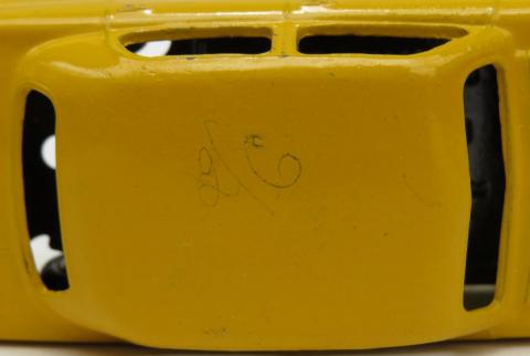 What is it that sets this model apart from all the rest? It is the roof, and what I had first thought was some hairs caught up in a temporary paint repair – until I put on my glasses! It still has, after all these years, its original price of 2/6, (two shillings and sixpence), written in pencil on the roof! I wonder why the original owner did not rub the price out? We all have seen countless pencil and ballpoint written prices on innumerable boxes, but this is the first time I have seen an original price still visible on the paintwork of a model. Has anyone else encountered something similar?