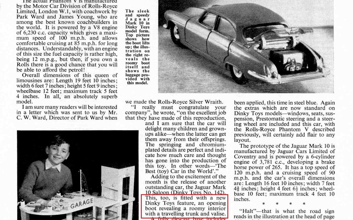 I have just pulled out my 142 Jaguar Mark 10, to check on its contents. It only has the trunk - no valise. With the box details only listing a trunk as the contents of the boot I wonder if the valise was a thought at the time the copy prepared by The Toyman was submitted to Meccano Magazine and then discarded as a cost-saving measure later on, although it is possible that a valise was added as a “bonus” with a number of models.