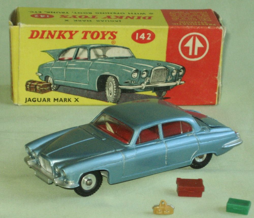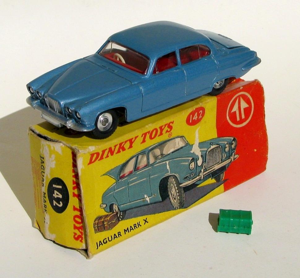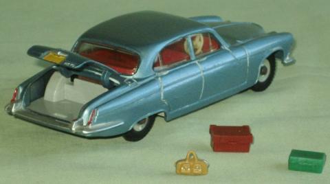 How many pieces of luggage should the Jaguar Mark X have? I recently acquired this one which has 3 pieces of luggage - a large brown case, a smaller green case and a fawn hand-bag. The illustration on the box shows just one piece of luggage. In Jacques Dujardins Dinky Toys Encyclopedia one picture shows 2 pieces of luggage and further down in the description it mentions "an opening boot containing a travelling trunk and valise".