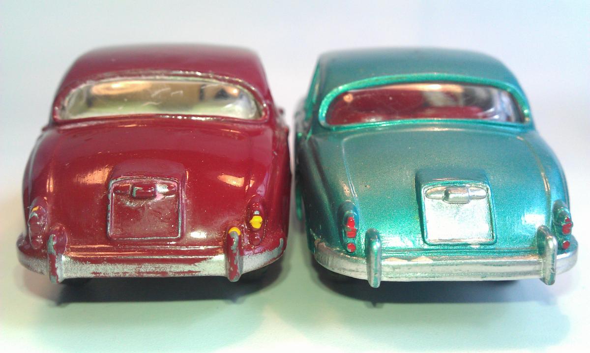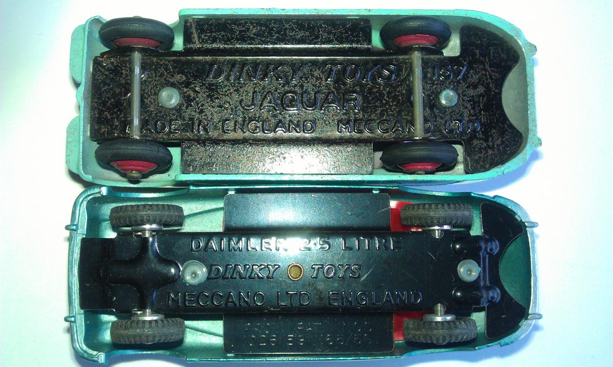 An interesting comparison of these two very similar models. Another difference between them of course is the change to smaller wheels and tyres for the Daimler, also used on the 269 Jaguar Police Car. (Personally, I think this style of wheel spoiled the appearance of some of the Dinky models of larger cars of the period, such as the Jaguar Mk10, Mercedes Benz 220, Superior Ambulances and others). The patent numbers stamped on the base relate to the design of the toys' features such as the steering and suspension rather than the styling of the car, so would not need to change.