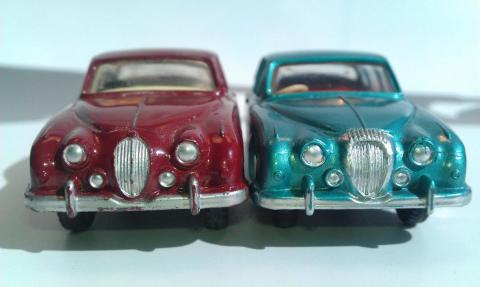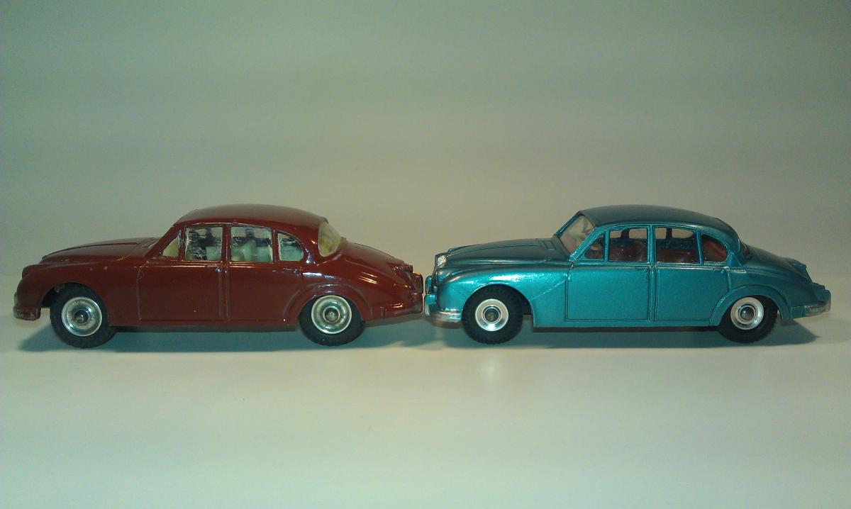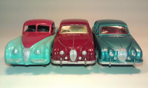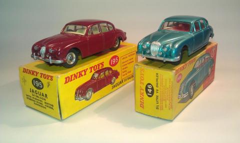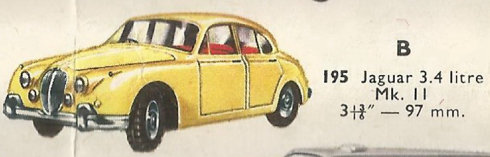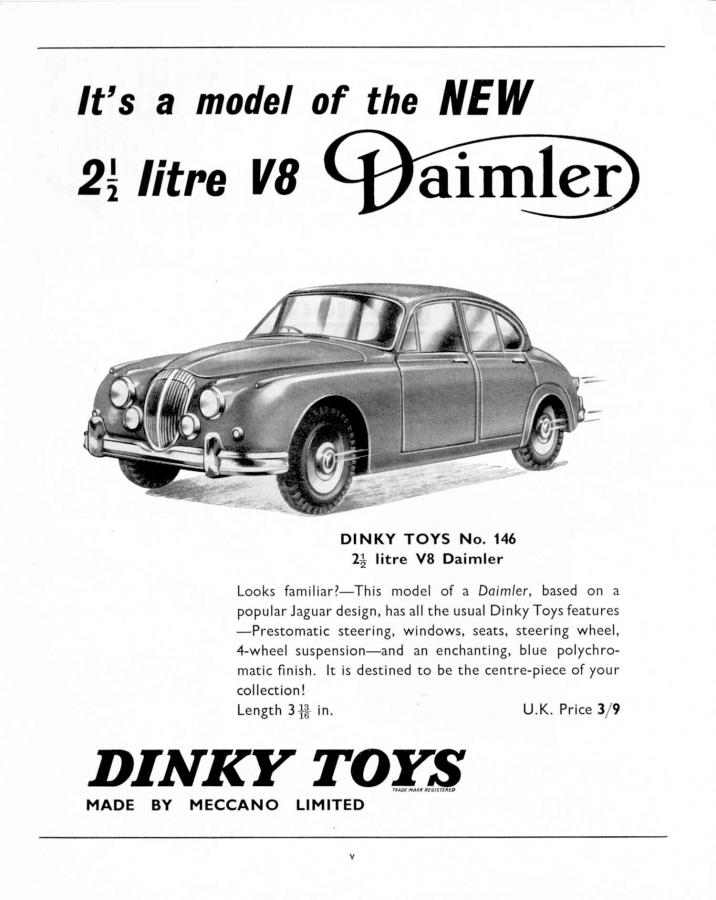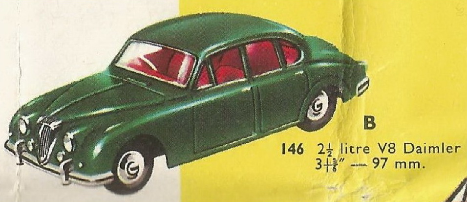 Model 146 Daimler is in fact an adapted model of 195 Jaguar 3.4 Litre saloon (1960-66). It has been given a new radiator grille, but the rest of the model is equal to the 195 Jaguar, with the exception of the base plate with a different model name. The Toyman in MM brags about the extra features of the Daimler, but they are exactly the same as the 195 Jaguar. Also "the new front seats of the splitbench type which can easily be converted to carry three abreast" of the 146 are equal to 195.