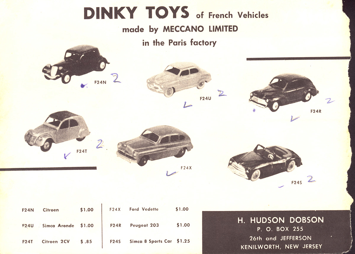 Ironically, "Made in France" persisted on French Dinky Toys until the end, but following the efforts of H. Hudson Dobson in the 1950s, and a limited selection imported by distributors A.C. Gilbert in 1963 and 1964, the French products disappeared from the U.S. market. When Lines Brothers took over in 1964, they were not interested in importing French models (they did a bad enough job at getting their pared-down Liverpool range into American shops), and subsequent distributors Covell Management and then AVA did not import French Dinky Toys either.