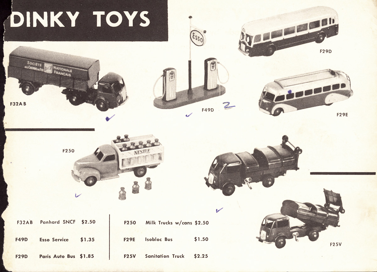 French Dinky Toys became available in the U.S. only via several specialist shops (for example, Memorable Things in Maryland, and Marque Products in California) that obtained limited quantities directly from the factory. I'll never forget contacting Memorable Things in the early 1970s, after having read their small advertisement in the back of Model Railroader magazine, and receiving from them a French Dinky catalogue full of wonders I'd been completely unaware of!