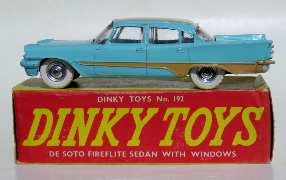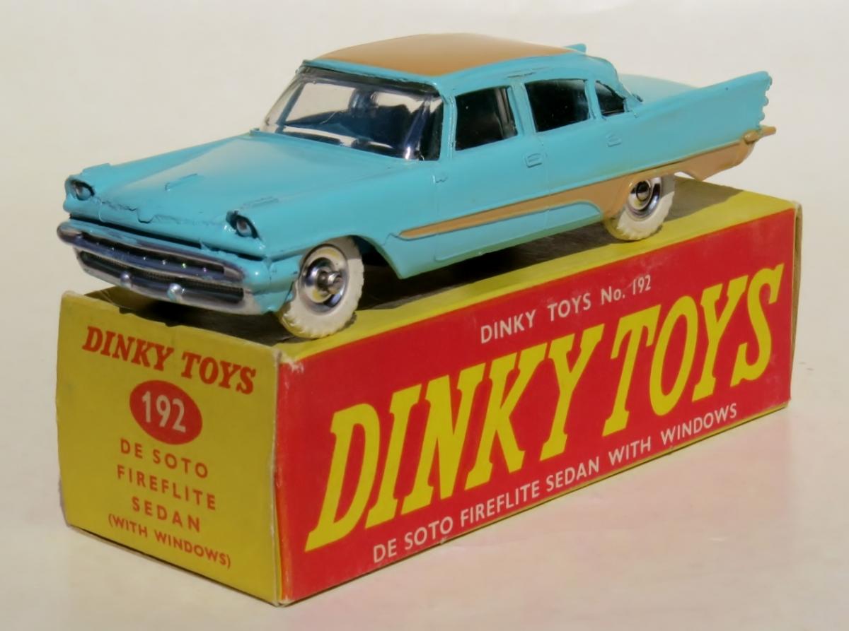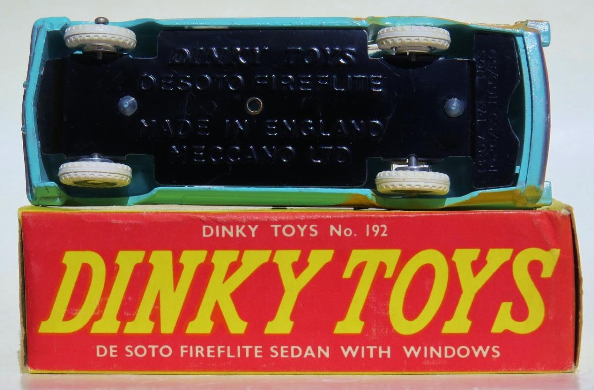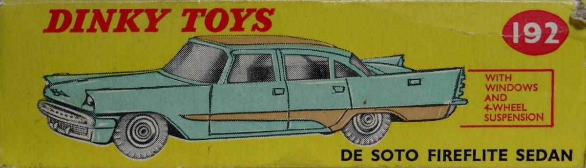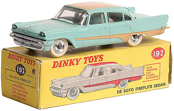 The 1957 model became the 1958 Dinky Toys 192 De Soto Fireflite with the design of the Fireflite having been initiated on 16 May 1957 through to 2 August 1957. On 18 March 1960, suspension was added, although I have never seen a 192 with suspension. (See comments below on the 258 U.S.A. Police Car.)