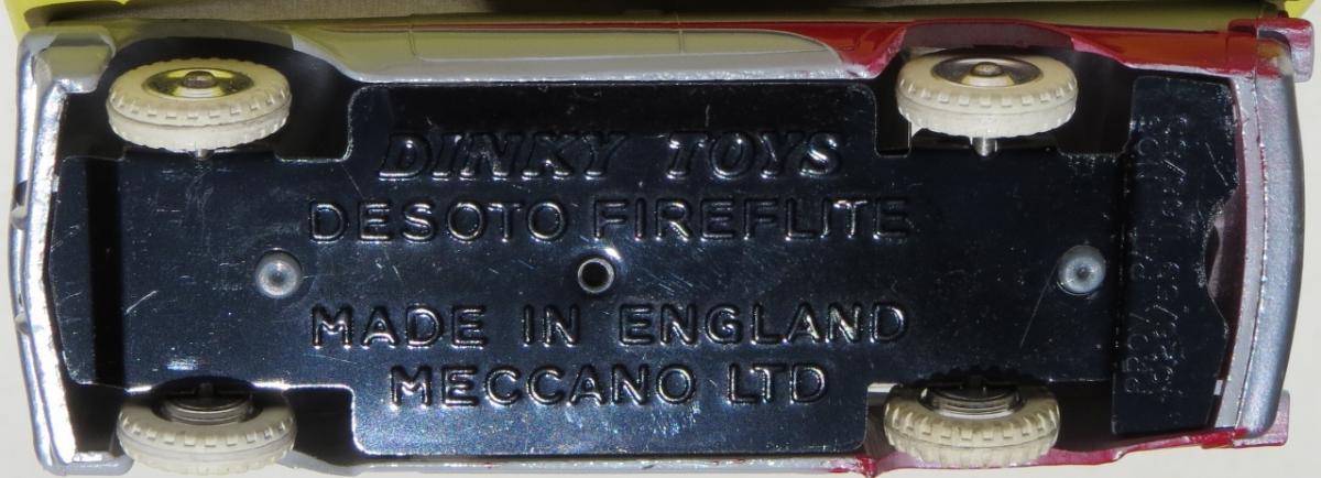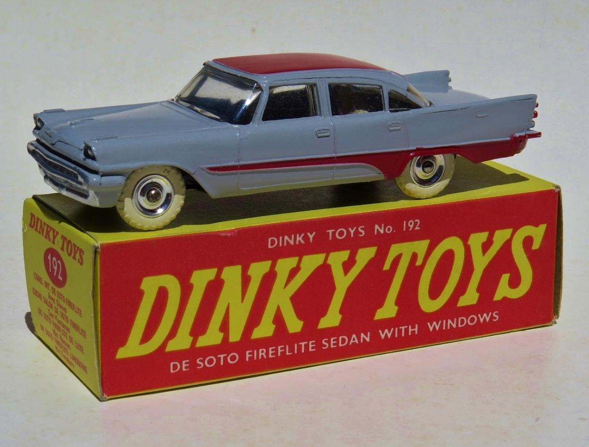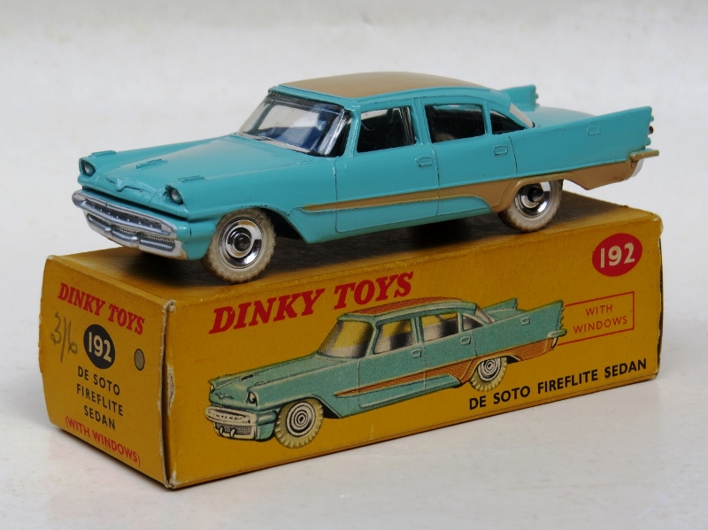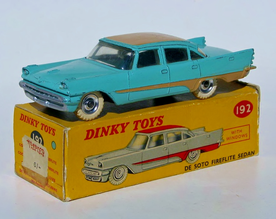 The 1957 model became the 1958 Dinky Toys 192 De Soto Fireflite with the design of the Fireflite having been initiated on 16 May 1957 through to 2 August 1957. On 18 March 1960, suspension was added, although I have never seen a 192 with suspension. (See comments below on the 258 U.S.A. Police Car.)