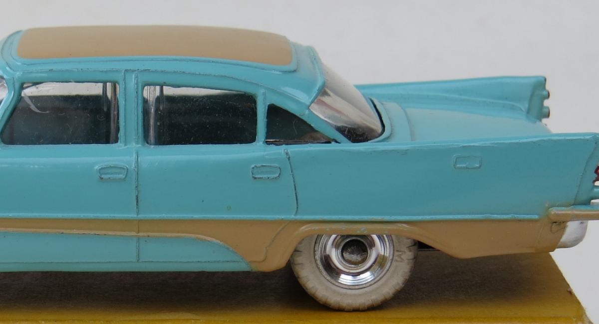 Then along came the following model, my latest acquisition, packaged in the plain red and yellow sided box, with suspension and no sales number on the base plate – the nicest version in “Dove Grey” and “Muscatel Maroon” (the colour names referred to by the Chrysler Corporation) I have received – a worthy addition to my collection together with the “Seafoam Green” and “Sahara Tan” (again the names given to similar colours by Chrysler) De Soto above, both in the final years of the model’s production and before the mould had became increasingly corrupted through usage. The rivets with this model are of the recessed type which would indicate an earlier production than the previous model in Seafoam Green and Sahara Tan.