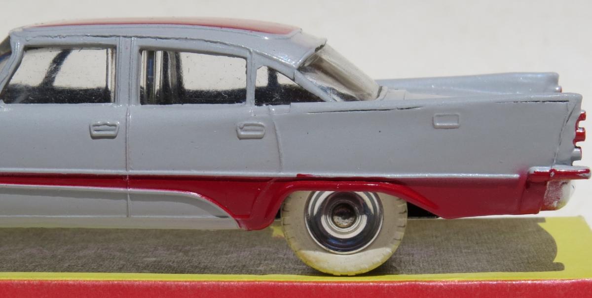 Purchasers of De Soto Firedomes and Fireflites were given a choice of having “quad” or dual headlights which was based on the home state of the purchaser and whether four headlights had been legalised which they were not in eight States at the beginning of 1957. Meccano chose to make their model with single headlights at the time the drawings were underway in the first half of 1957.