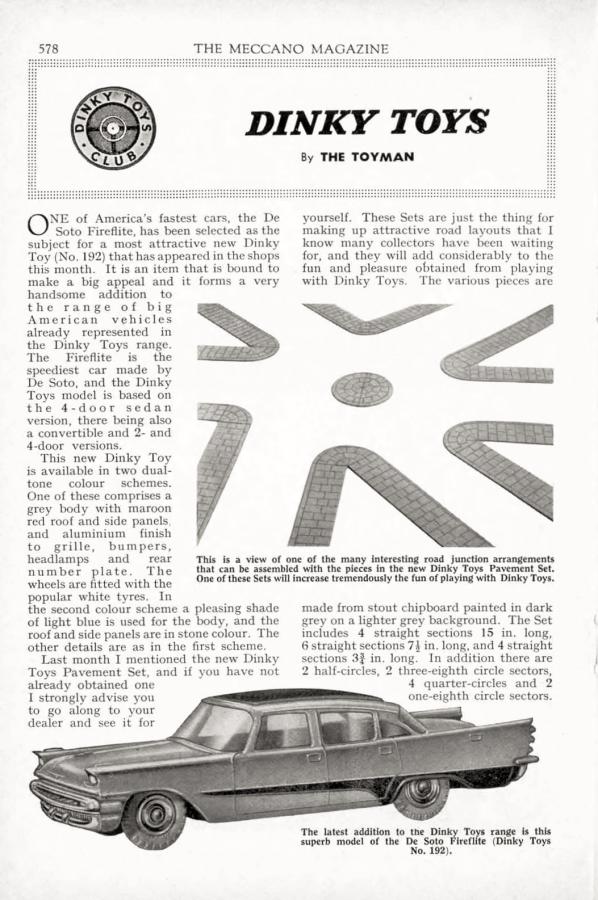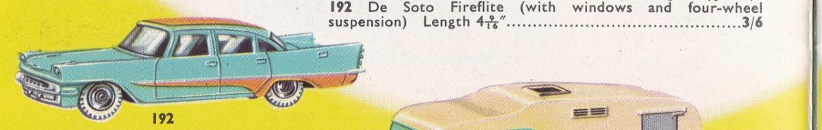 “One of America’s fastest cars, the De Soto Fireflite has been selected as the subject for a most attractive new Dinky Toys (No. 192) that has appeared in the shops this month. It is an item that is bound to make a big appeal and it forms a very handsome addition to the range of big American vehicles already represented in the Dinky Toys range. The Fireflite is the speediest car made by De Soto, and the Dinky Toys model is based on the 4-door sedan version, there being also a convertible, and 2 and 4-door versions.