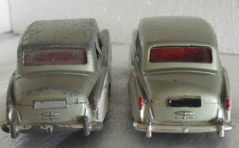 There is a casting variation on this model. Otherwise it would not be a British Dinky Toys. The later models had a reinforced front bumper so that a tab of the base plate could be inserted under it. The front rivet was deleted but the hole in the base plate remained.