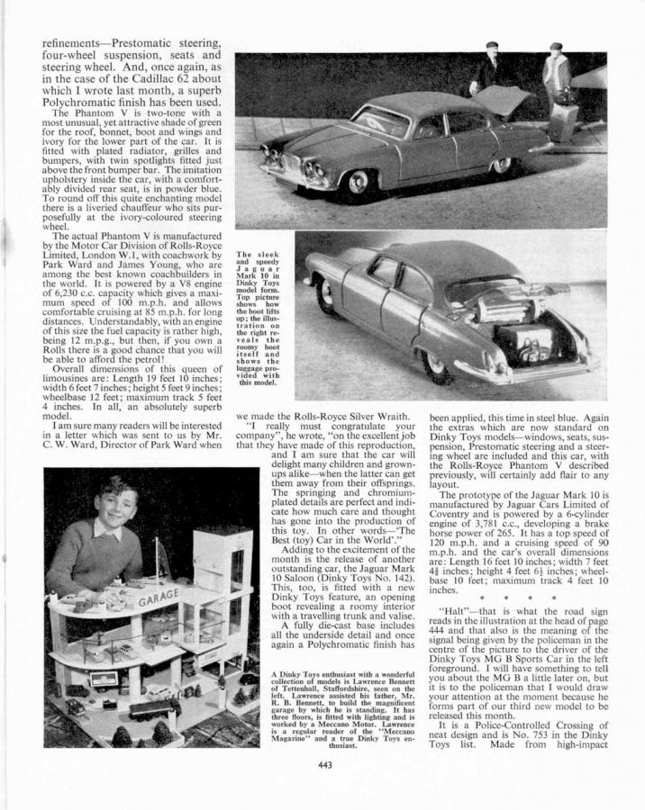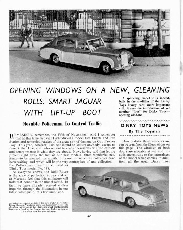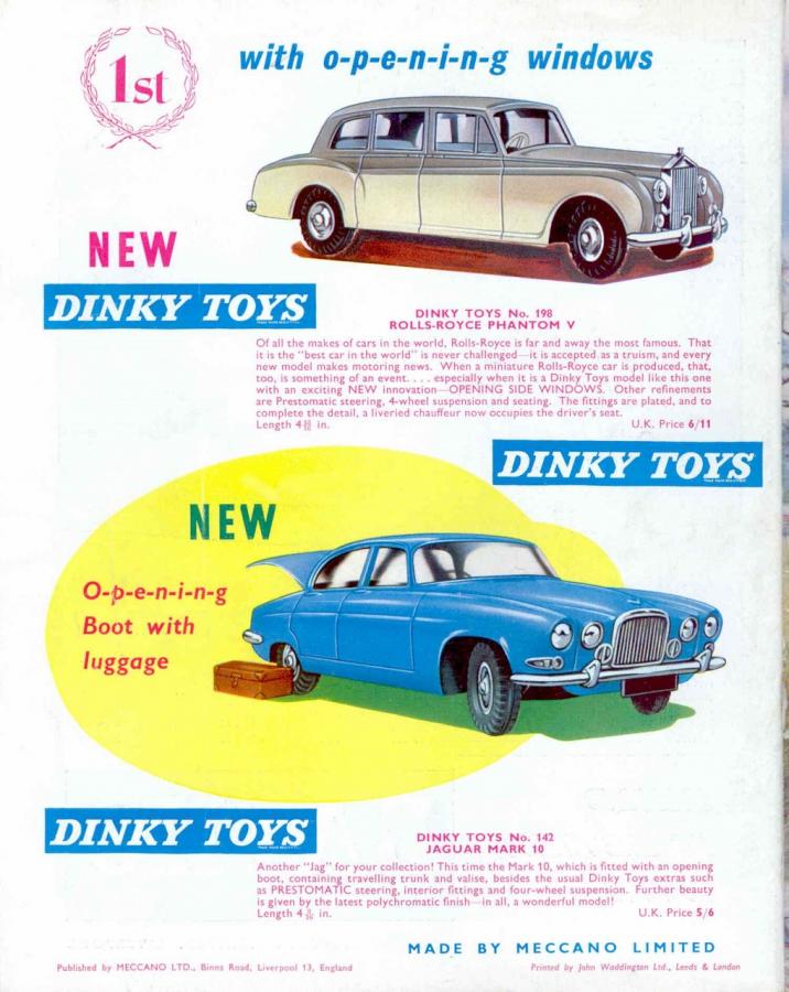Finally in the November 1962 issue of The Meccano Magazine, the back cover showed the new Rolls Royce Phantom V with its unique feature to Dinky Toys, o-p-e-n-i-n-g windows! Also a new feature – a chauffeur, but unfortunately, he is not in the picture which I can only surmise his absence was due to him having ducked out on a call of nature!
