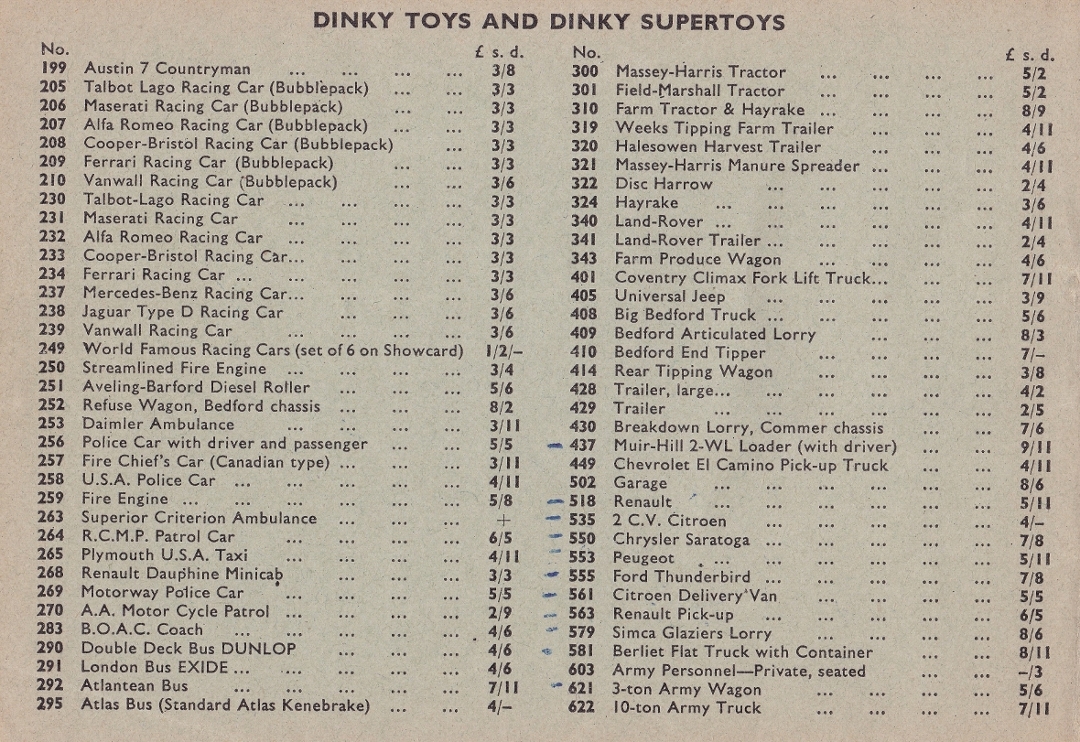 Photographs of a number of boxed models in the later shade of grey and very pale grey have a price of 6/11 written on the box which is a real bother!  Why could it not have been something different, as 6/11 was current from the date it was launched in November 1962 until October 1966 when the price increased to 7/-. It did not return to 6/11 until at least April 1968 with the following month, May 1968, the price reverted to 7/-. Catalogues have not been of much help as the ones in which the model appears, the colour is its first scheme and the interior is shown as being pale duck-egg blue.