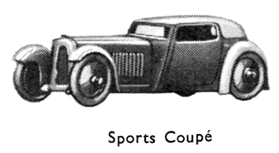 The Sports Coupé was part of the Hornby Series Modelled Miniatures No. 22 Motor Vehicles. Set No.22 consisted of 6 motor vehicles: Sports Car, Sports Coupé, Motor Truck, Delivery Van, Farm Tractor and Army Tank.
