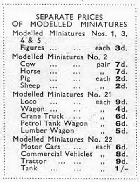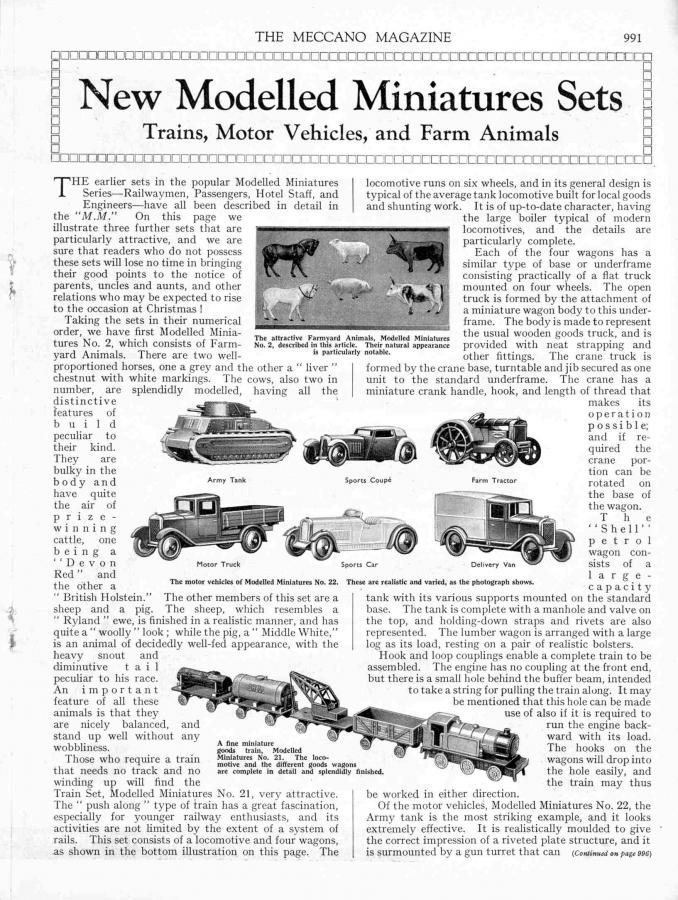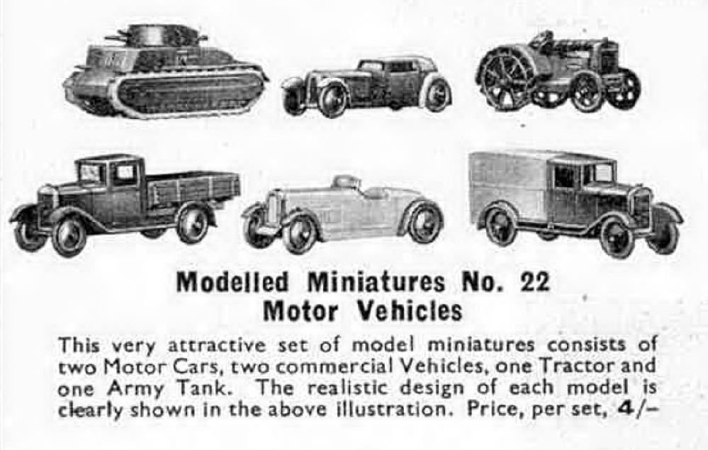 It was first announced in Meccano Magazine of December 1933 in which 3 new Modelled Miniatures sets for Christmas were promoted with the words: "On this page we illustrate three further sets that are particularly attractive, and we are sure that readers who do not possess these sets will lose no time in bringing their good points to the notice of parents, uncles and aunts, and other relations who may be expected to rise to the occasion at Christmas!" The 3 new sets were set No. 2 Farmyard Animals, set No. 21 Goods Train and set No. 22 Motor Vehicles.
