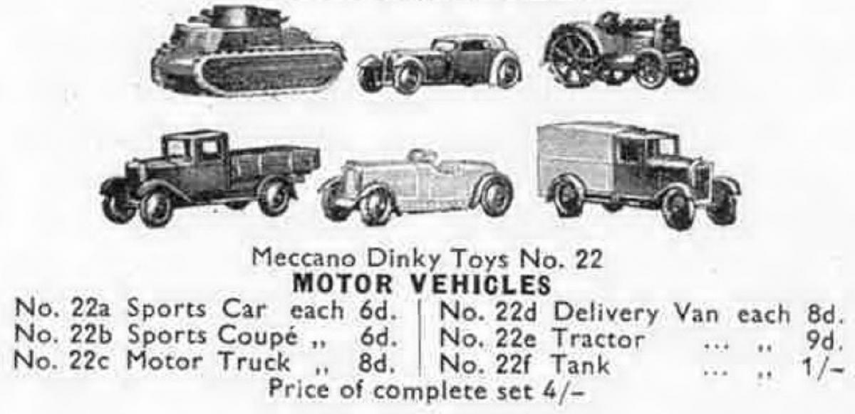 It was not until MM April 1934 that Hornby Series set no. 22 Motor Vehicles were called as Meccano Dinky Toys No. 22 and all 6 motor vehicles were given their own sales number for the first time.
