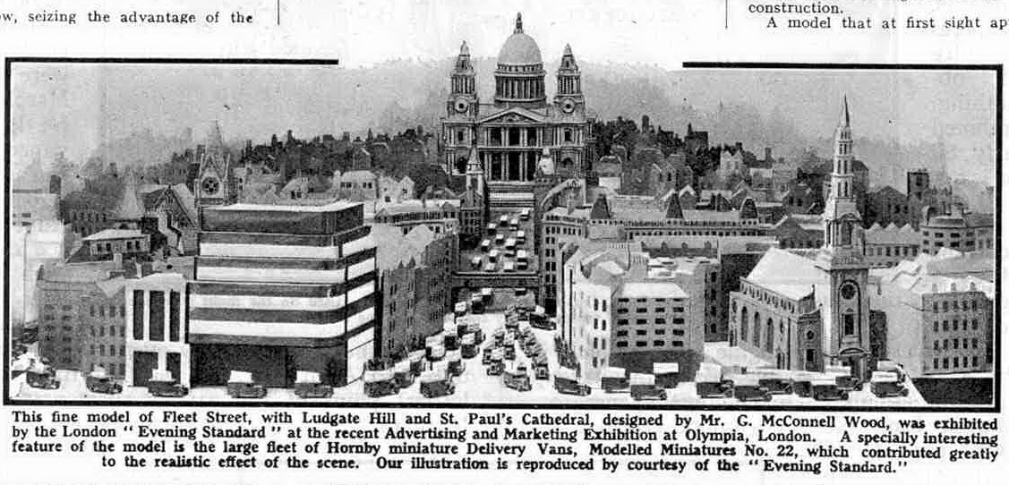 “Maybe they were available even earlier, as in Meccano Magazine for September 1933, there is a photograph taken at the Advertising and Marketing Exhibition at Olympia of a model of Fleet Street designed by G. McConnell Wood and exhibited by the London Evening Standard, with a large fleet of 22d Vans carrying the newspapers to their destinations. The date of this exhibition was July 17-22 1933, so this vehicle at least must have been in production then, though it is quite possible that it was not at that time on general sale. It is likely that the vans were lettered “London Evening Standard”, though it is not possible to distinguish this from the rather poor reproduction in Meccano Magazine and unfortunately, the original is no longer in the Evening Standard Archives, so the existence of potentially the first diecast U.K. promotional vehicle must remain for the time being a matter of speculation. “
