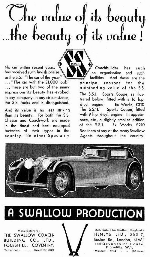 The SS1 was a low-built, two-door, sports coupe that featured two passenger seats and room in the luggage box. In order to increase sales, Lyons encouraged owners of Swallow cars to enter motoring competitions. The first SS1 made its racing debut in the 1932 Torquay 1,000-mile rally.