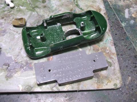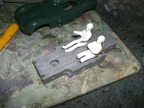 There is a 'covered' seat in the casting which I machined out. The baseplate was irretrievably rusty, gone to holes in places so I made a mould from another baseplate in good condition and cast a resin one. AS it's not feasible to make very thin resin casts I made it much thicker and cross-drilled it for new axles. To get the driver and navigator in needed recesses as shown. To make the new thick base fit I had to machine into the edges of the car casting...