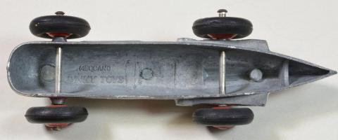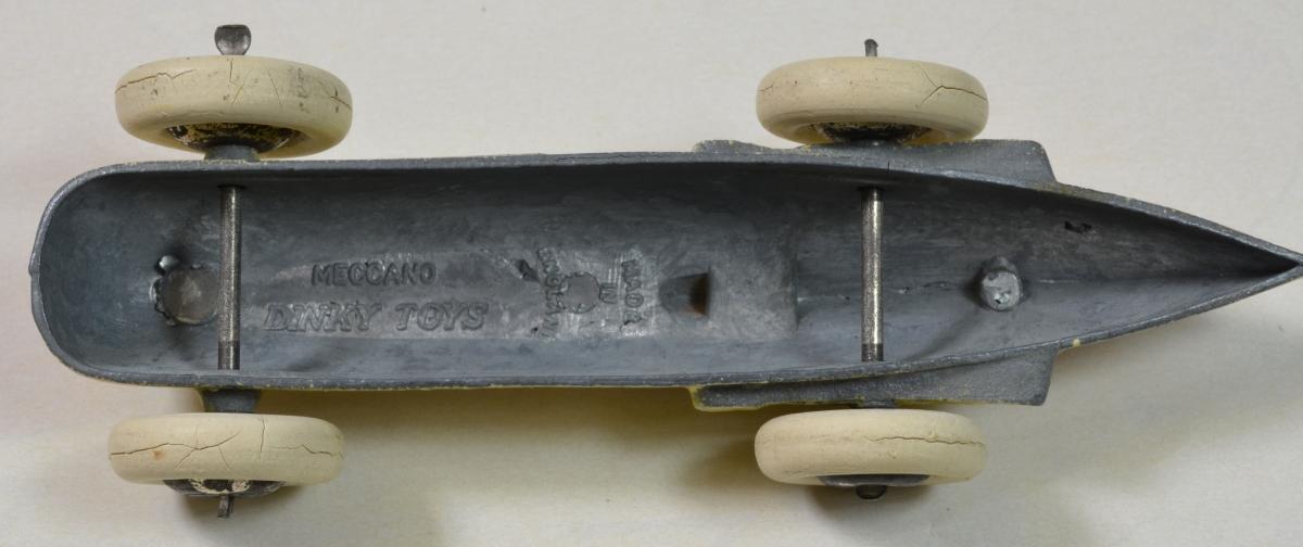 There are several variations of this record car....early ones had no driver, and than there were exhaust pipe changes as well.  I believe mine is one issued right before the war, with the driver and the late exhaust design.  Besides the thinner axles, these pre-war version also had no structural webs running from side to side, as some of the post war designs showed.