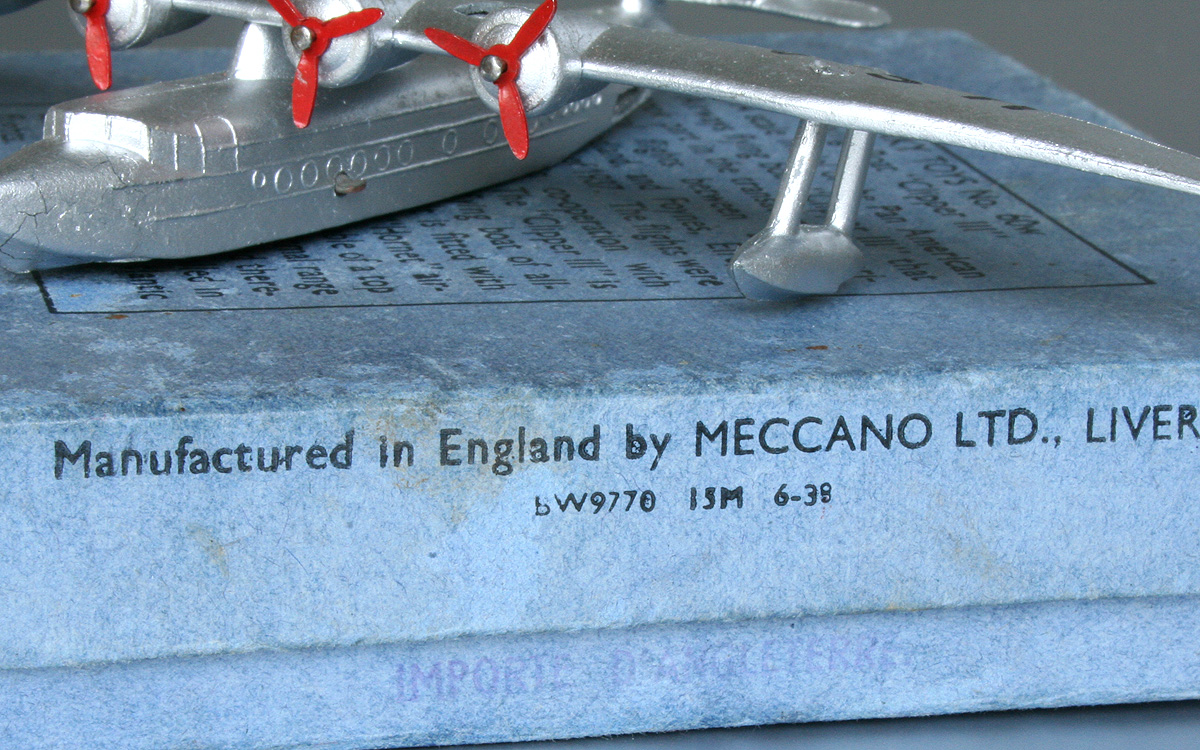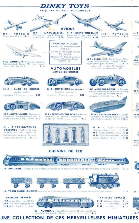 1938 Jouets d’ete of Mai 1938 shows more UK models. 30g Caravan, 151a Tank, 152a Tank, 23c Mercedes, 23d Auto Union, 23e Speed of the Wind, 23m Thunderbold, 60h Singapore flying boat, 60m Four engined flying boat, 60w Clipper III, 60r Empire Flying boat, 25h Fire engine. In Le livre du meilleurs jouets 1938 all these UK models are also offered. I have found these models at swapmeets in France and the Paris shops but never marked made in France. I presume Meccano Liverpool wanted to export more models also to France. Keep in mind that the UK Dinky models were exported to many countries except France. On the other hand no French models were exported until 1938 to England and so we find none of the french models in catalogues pre war in Netherlands, Switzerland, Belgium, Italy, Denmark, Spain etc. before 1938.