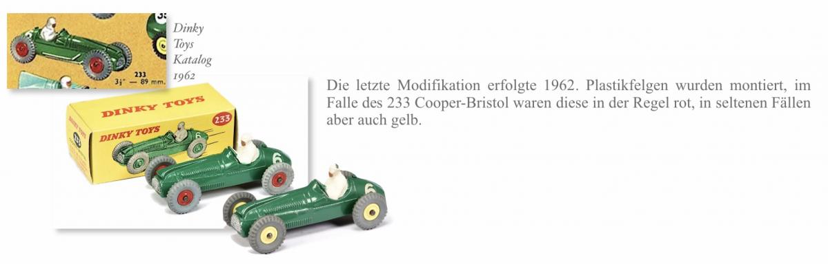 Looking at my Cooper-Bristols, I found a small variation in the casting: Unlike the first 23G Cooper-Bristols, all the later 233 Cooper-Bristols (from 1953/54 onward) carried small vertical lines on both sides behind the racing numbers, which have become a little fatter too.