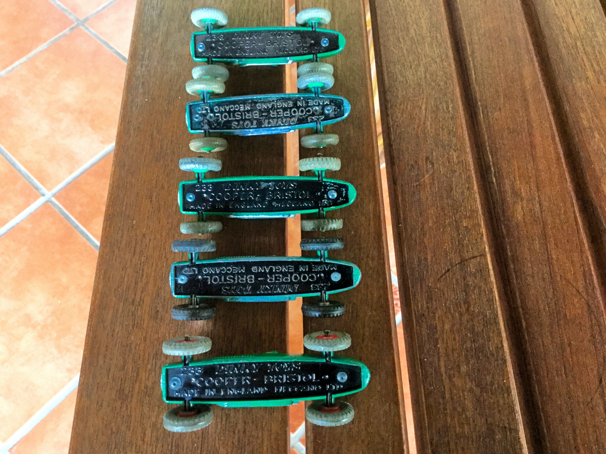 I have brought up this issue at TMT some time ago, so I think it would not hurt to bring it to your attention here again. I am talking about the base plate of the 23G/233 Cooper Bristol Racing Car and to support my point I enclose a picture of all the variations known: