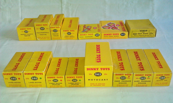 I collected all existing individual dual numbered boxes of the Farm Equipment in the 27 series and I like to show this. Only my 27g and 323 are reproduction boxes.