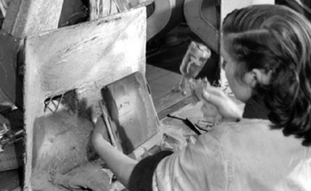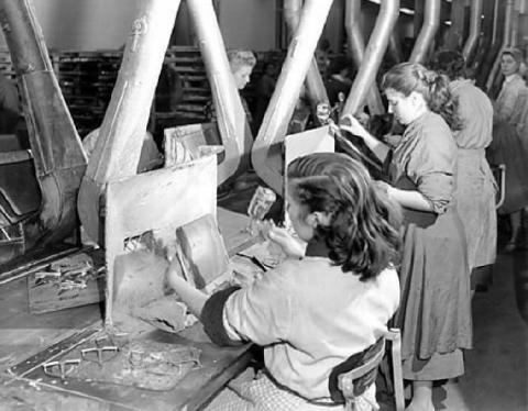 In the photo below from 1957, the Disc Harrow is being mask sprayed painted at the Meccano factory in Liverpool. The already red painted Disc Harrow is pushed into the back of the mask and the 2 x 4 upper flats of the front frame, which are visible in the mask, are being painted yellow with the spray gun. In the close-up photo is this better visible.